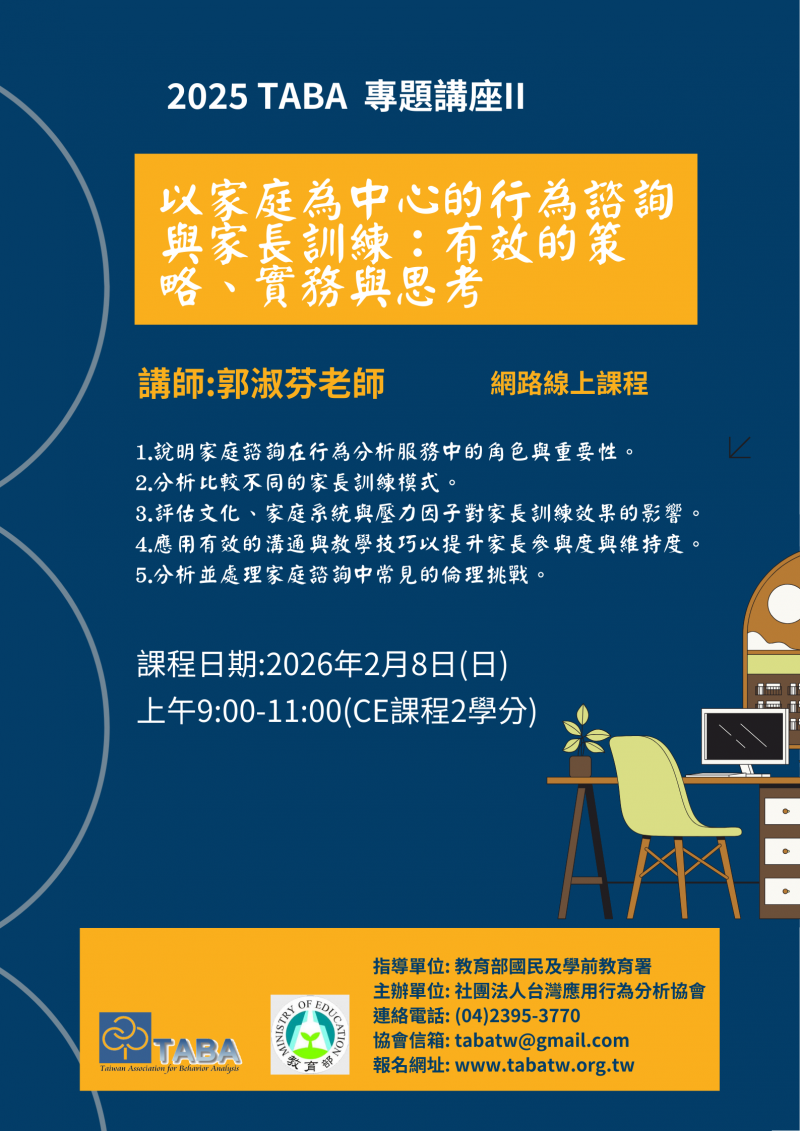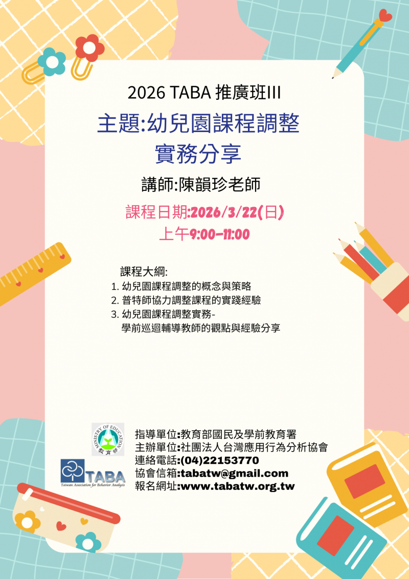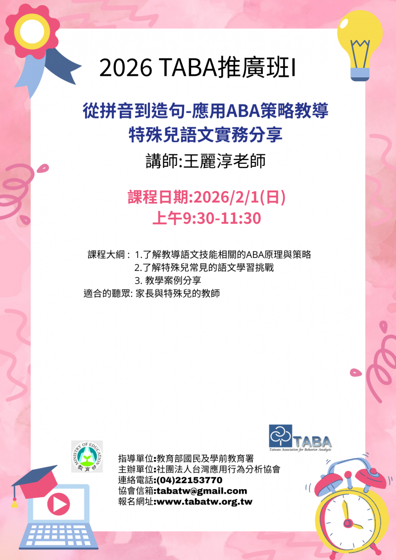 課程六:應用ABA提升認知與閱讀技能的策略與教學分享 - 詳細資訊
